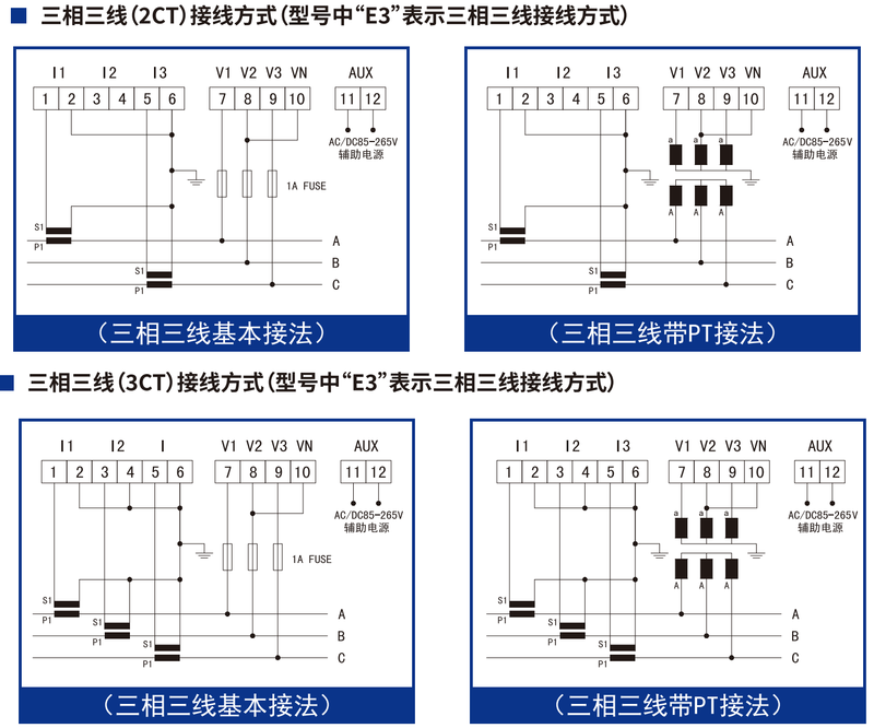 备注:型号中“E4”表⽰三相四线接线⽅式;“E3”表⽰三相三线接线⽅式。
