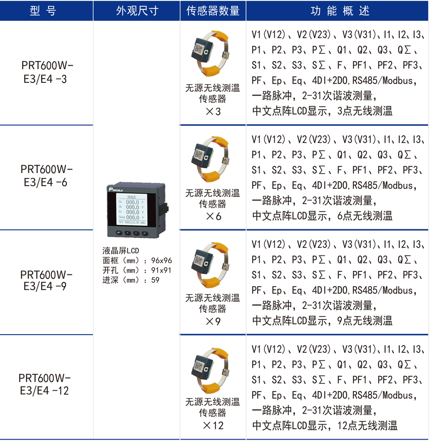 PRT600W-E4-6为:三相四线+6只⽆线测温传感器;