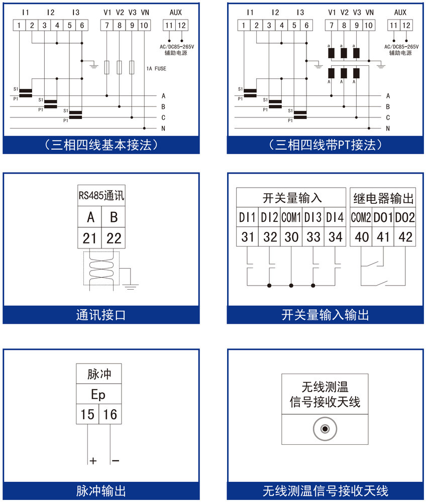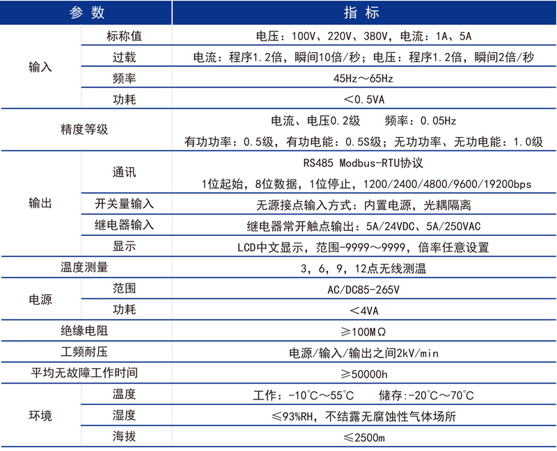 全电量测量;0.5S级有功电能计量;3.5寸大屏幕液晶;中文显示;最多12点无线测温功能。